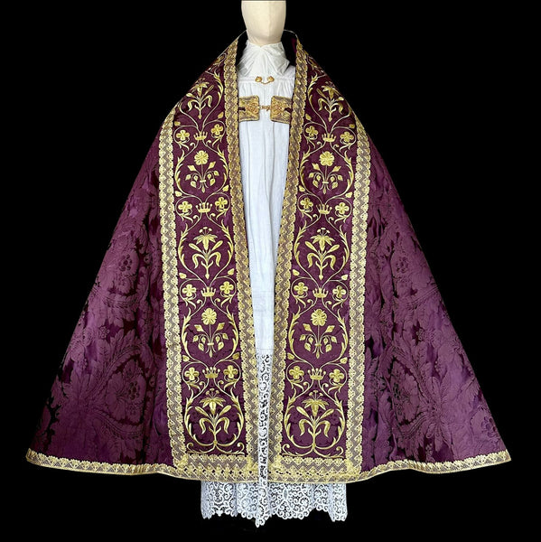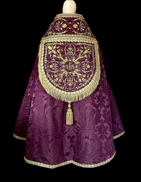 Embroidered Roman style cope on a silk damask, with gold embroidered designs in the shield and on the orphrey. On the shield, the designs take form of a cross, surrounding a gothic-scripted IHS monogram. Fine lace trims and metallic fringes. It comes with the Stole. Shantung lining.
