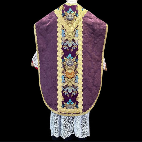 Venetian style Missa Cantata set hand-made in purple silk damask with purple pure silk brocade orphreys. The shield has the typical Venetian cut. Fine metallic gold trims. Antique tassel. Metallic clasps. The set comes with two stoles, maniple, chalice veil and burse. Purple shantung lining.