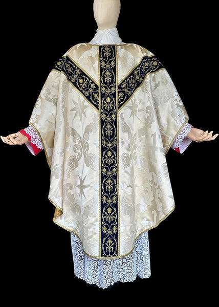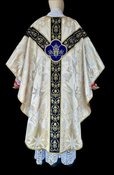 Bespoke gothic revival chasuble hand-made in a custom made pure silk cream silk damask showcasing a design which includes the Dominican cross and the eight pointed stars. The orphreys have a Marian theme and have been embroidered upon different shades of blue velvet. The set comes with stole, maniple, veil and burse. Custom made silk multicolored fringes. Butter gold shantung lining.