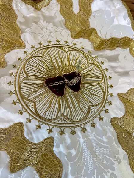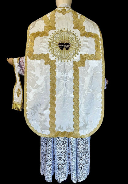 French Low Mass set hand made in Italian white silk damask. The set comes complete with chasuble, stole, maniple, burse and chalice.