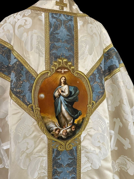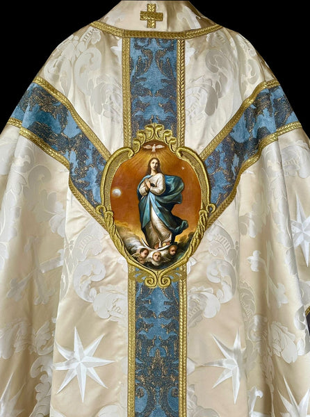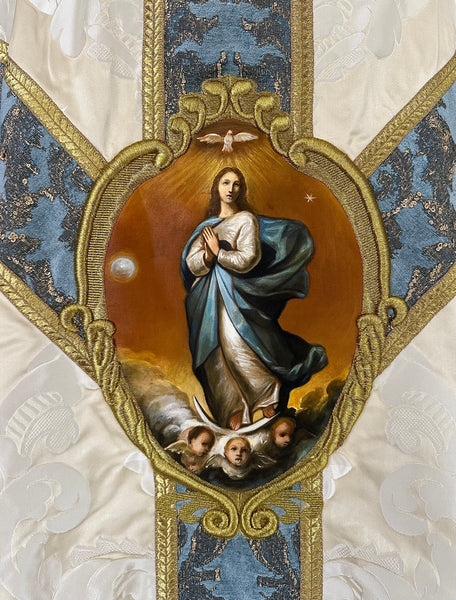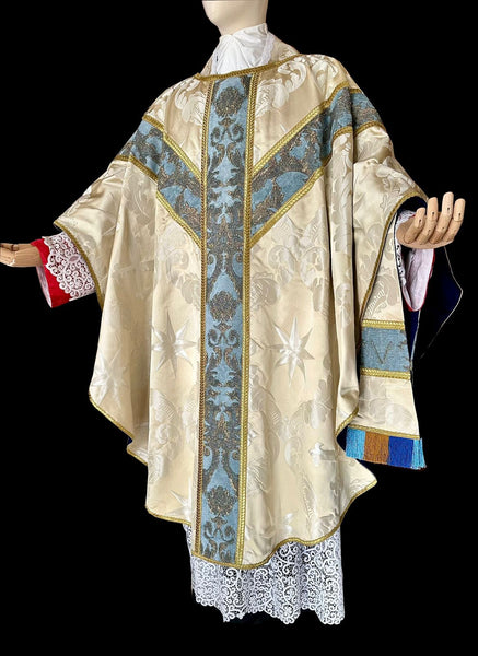 This is gothic Marian Low Mass set hand-made in a custom made pure Italian ivory silk damask that includes the Dominican cross and the eight pointed stars. We used a blue Y velvet orphreys, decorated with fine antique gold trims and an embroidered cartouche as verter piece showing a silk depiction of the Virgin of the Immaculate Conception. The set comes complete with stole, maniple, burse and chalice veil. The multicolored silk fringes were custom made. Blue shantung lining.
