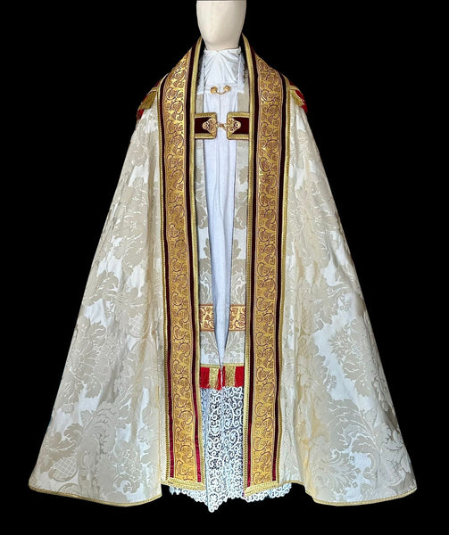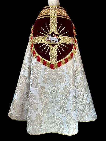 Gothic style cope made in ivory silk damask with burgundy and bronze velvet orphreys. Lamb of God embroidery upon burgundy velvet on the shield and red and gold silk fringes. It comes with the stole. Burgundy shantung lining.