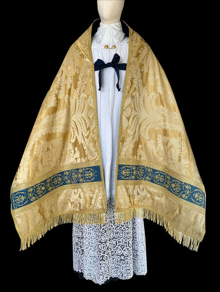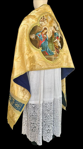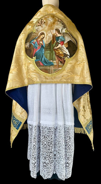 Humeral veil made in a beautiful high-end Venetian gold pure silk damask with blue silk damask embroidered orphreys. The center includes a painted silk depiction of the Annunciation, painted by an Italian artist in the Renaissance tradition, using silk painting techniques and materials. Gold metallic trims and canotiglia fringes used for decoration. Navy blue shantung lining.