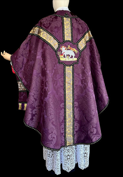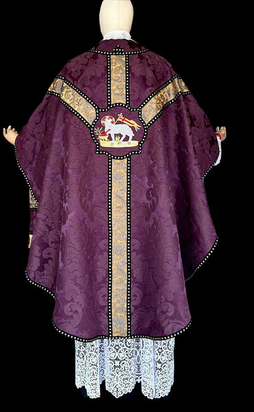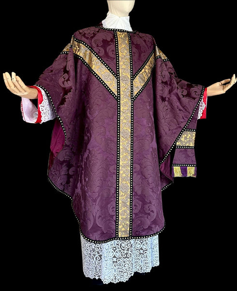 Gothic revival set in purple silk damask with gold and silver silk damask orphreys, black and gold trims and purple shantung lining. Multicolored silk fringes for the stole and maniple. The set comes complete with chasuble, stole, maniple, burse and chalice veil.
